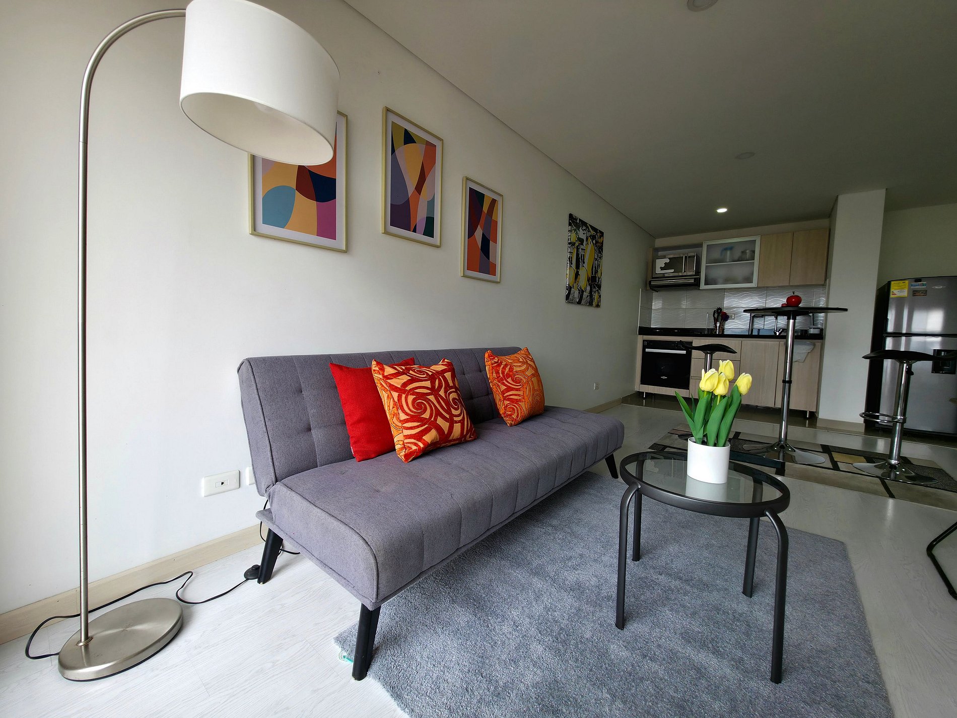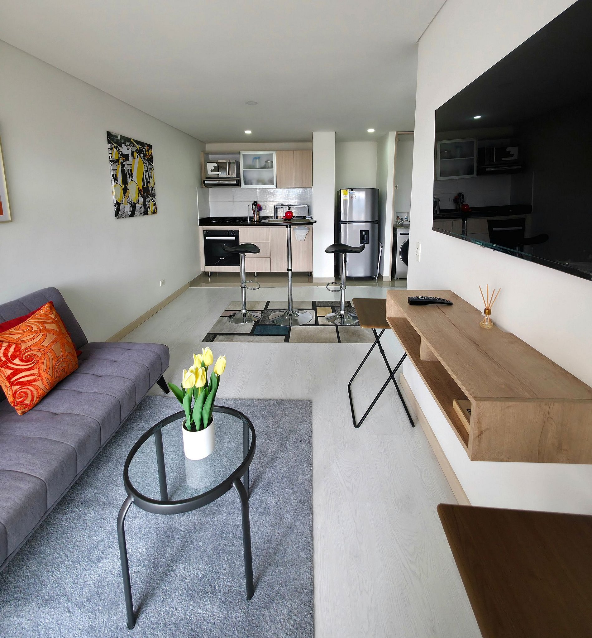 Apartaestudio con amplios espacios, el cuarto principal cuenta con iluminación natural y hermosa vista de Cajicá, cama doble, amplio Closet de ropa, baño privado y calentador de agua. Sala de estar con Sofacama doble, comedor y una amplia cocina integral equipada, espacio de estudio para trabajo Home Office y un amplio balcón con vsita hacia el coliceo de Cajicá y la sabana.