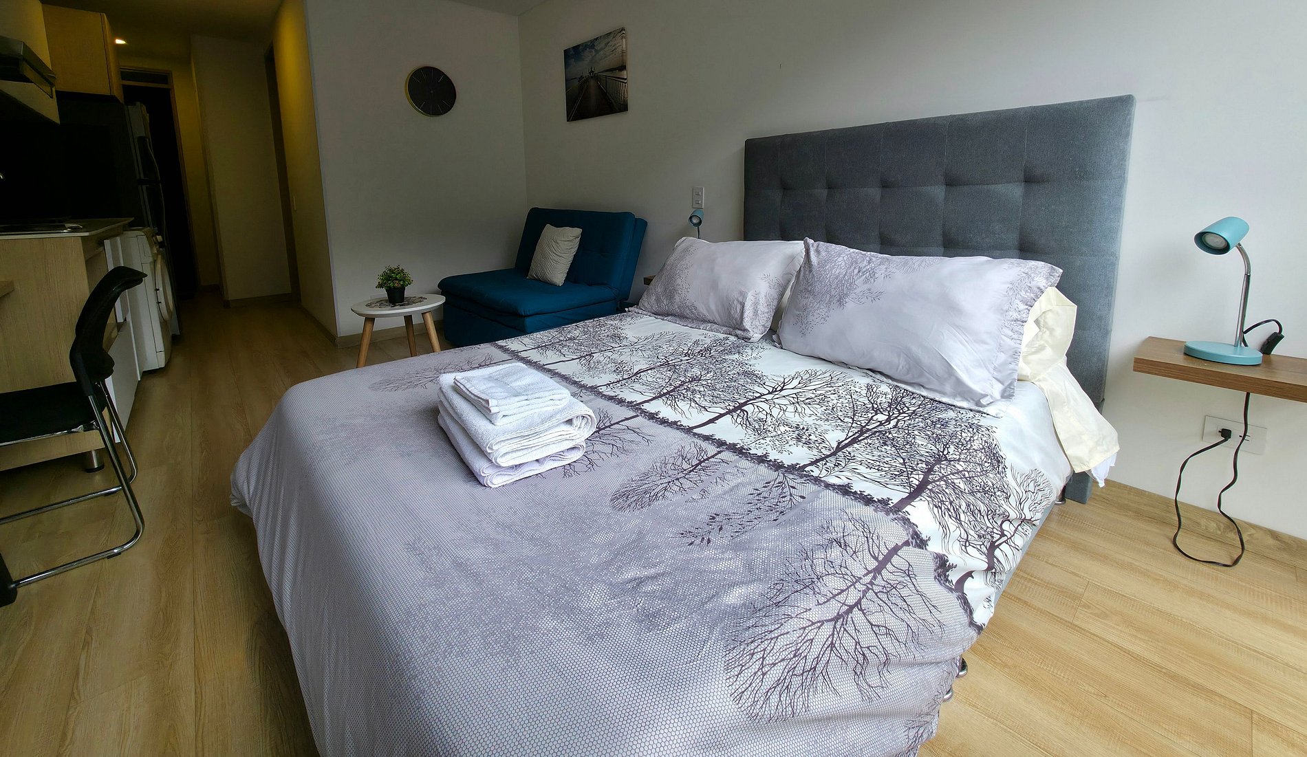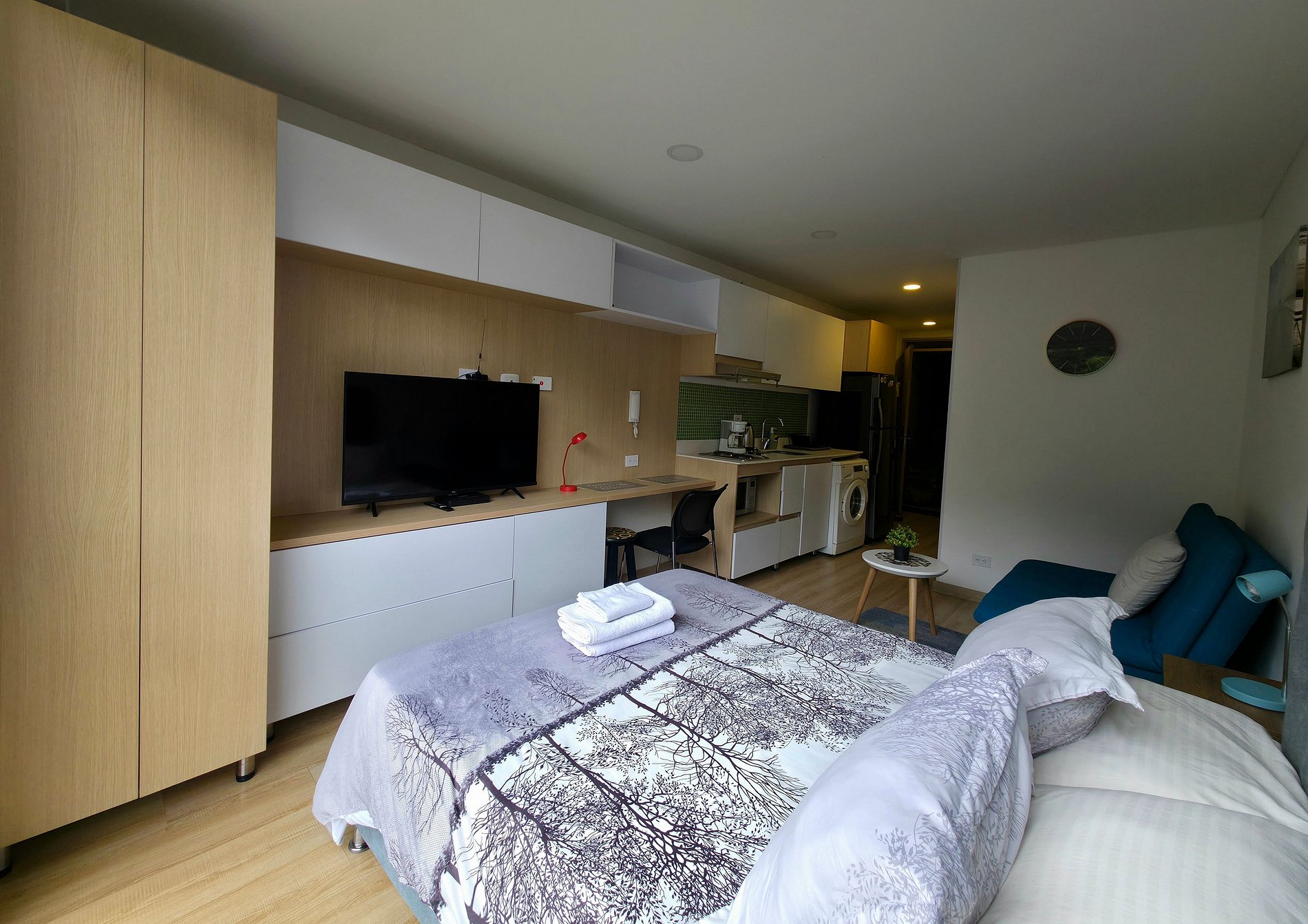 Enjoy the tranquility and rest in this cozy loft with mountain views, 12th floor, equipped kitchen, microwave, refrigerator, washing machine, 50" TV, Netflix, fiber optic wifi. Located 200 meters from Carrera 7 and Calle 155, Easy Transportation access, close to Usaquén Park, T zone, Country, Unicentro Shopping Center, Palatino, Hacienda Santa Bárbara, Cedritos, restaurants, banks. Book now and live a unique experience in the social areas such as Coworking, Gym, Boxing Ring and terrace.