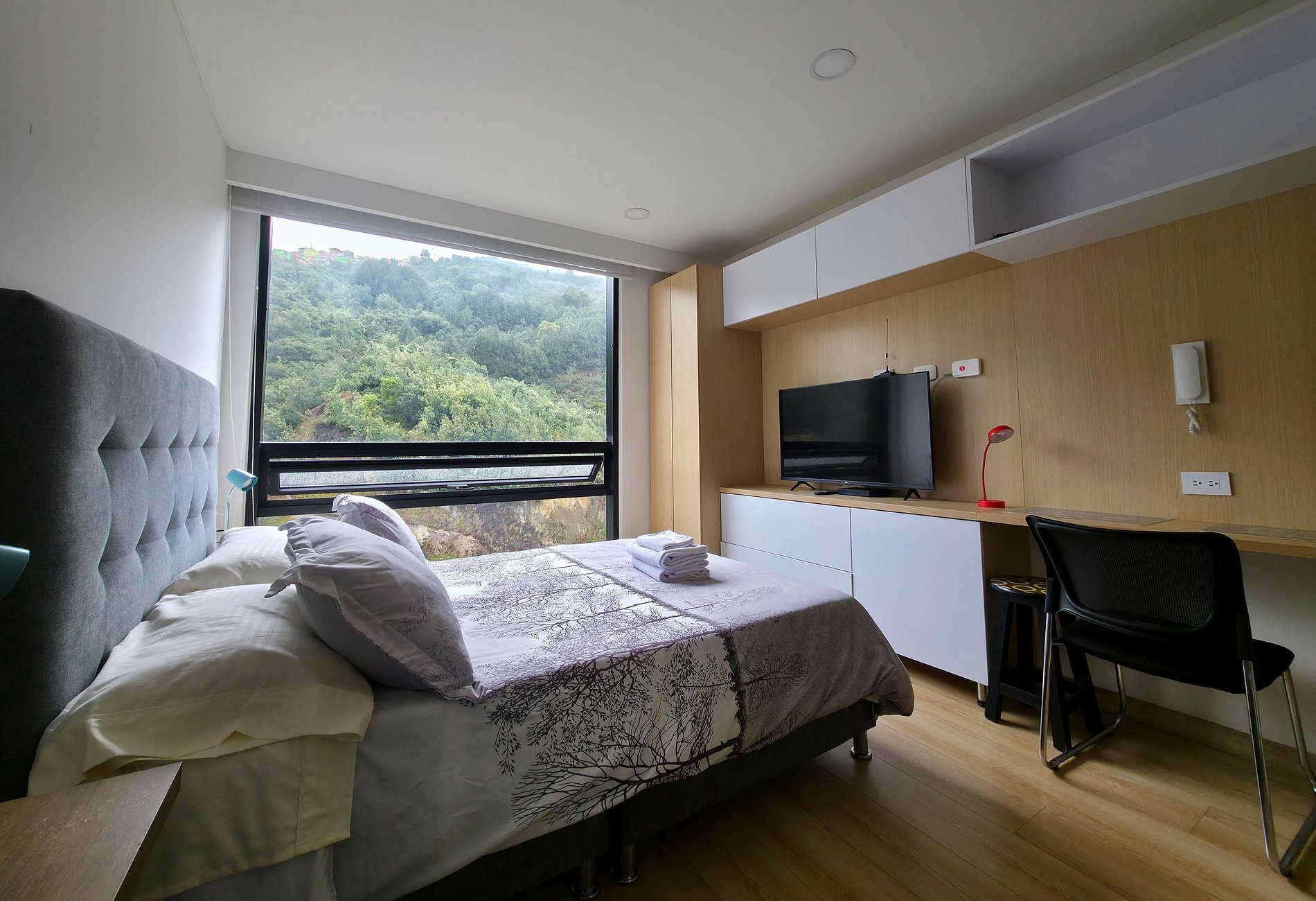 Enjoy the tranquility and rest in this cozy loft with mountain views, 12th floor, equipped kitchen, microwave, refrigerator, washing machine, 50" TV, Netflix, fiber optic wifi. Located 200 meters from Carrera 7 and Calle 155, Easy Transportation access, close to Usaquén Park, T zone, Country, Unicentro Shopping Center, Palatino, Hacienda Santa Bárbara, Cedritos, restaurants, banks. Book now and live a unique experience in the social areas such as Coworking, Gym, Boxing Ring and terrace.