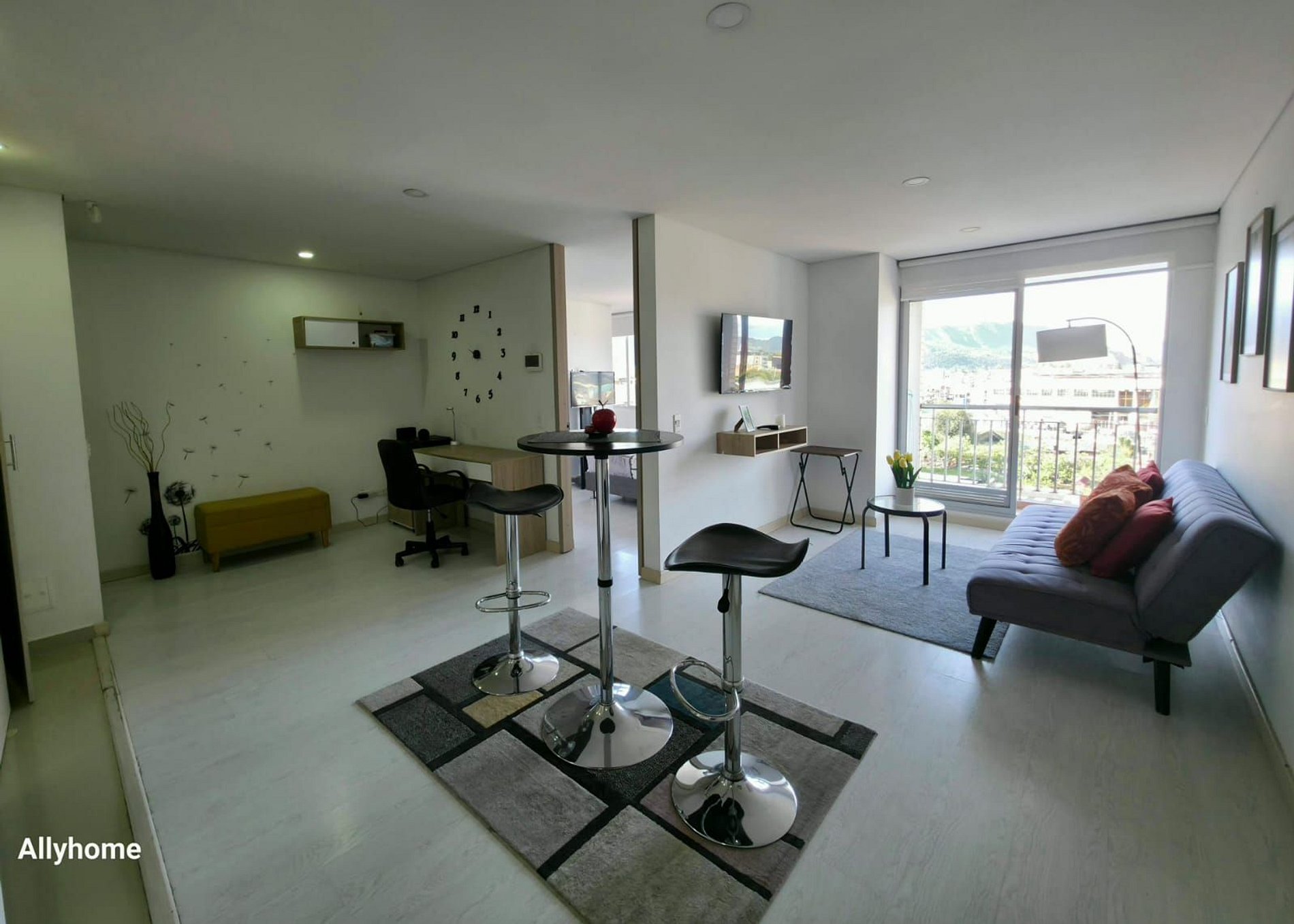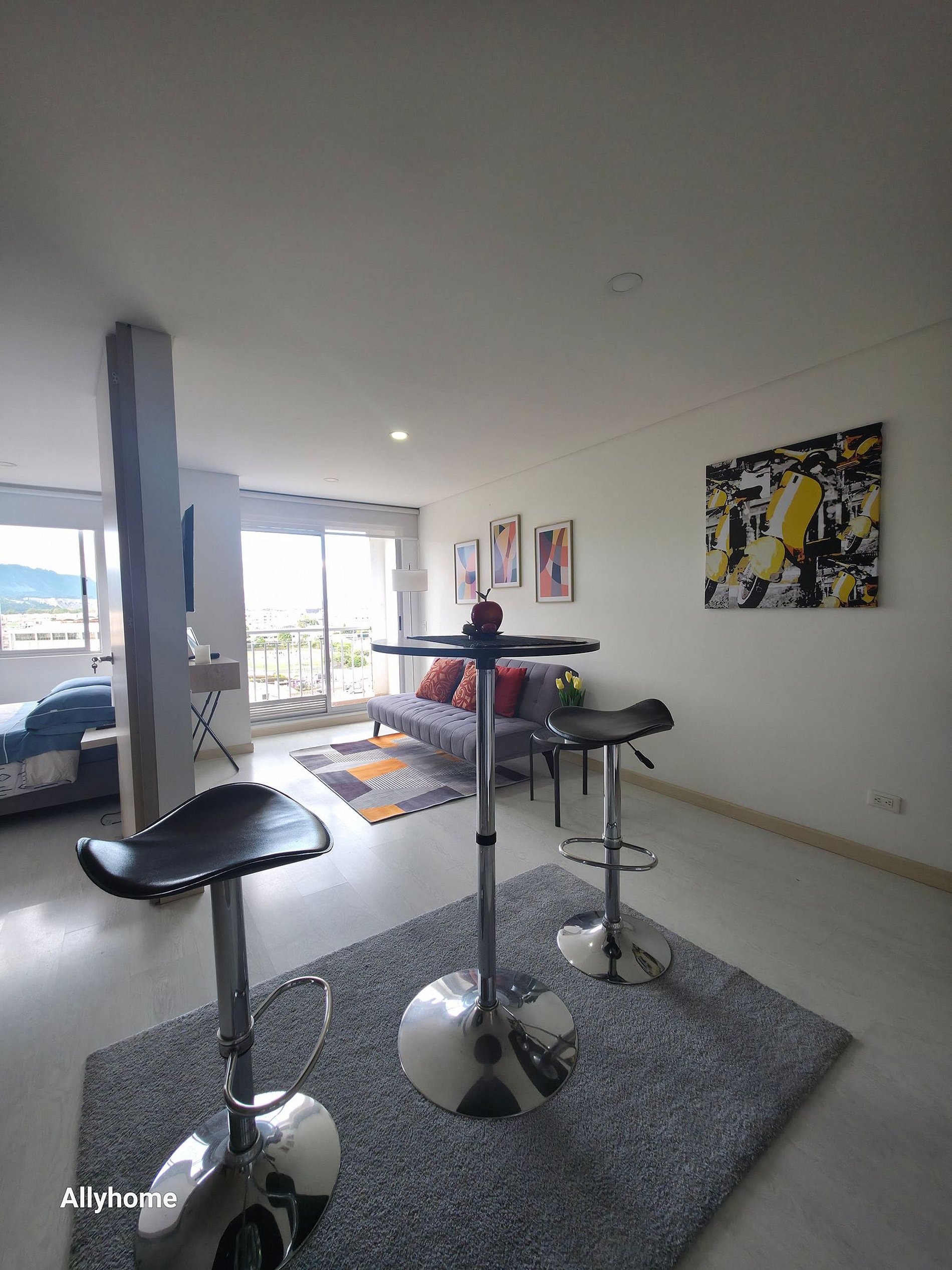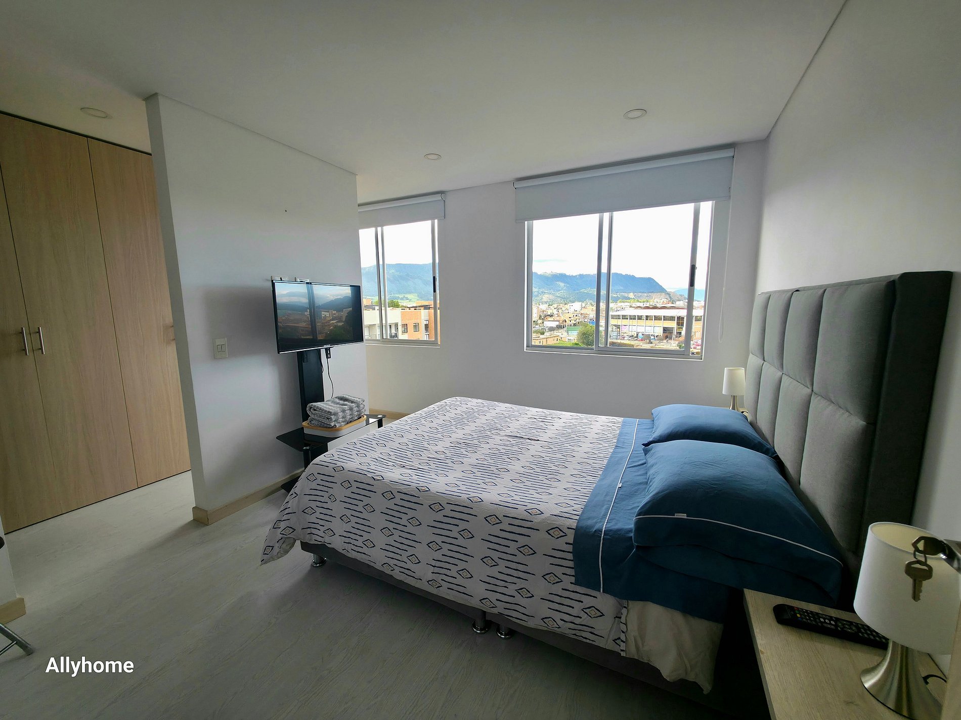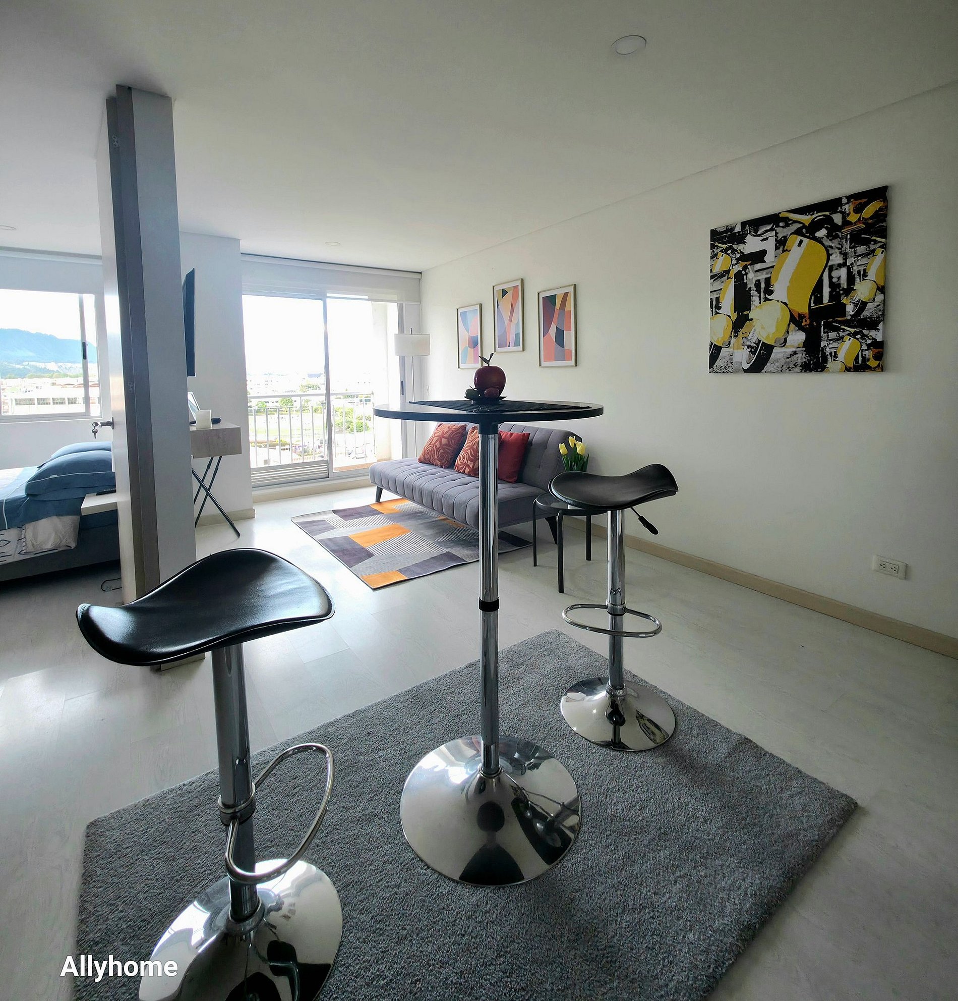 Apartaestudio con amplios espacios, el cuarto principal cuenta con iluminación natural y hermosa vista de Cajicá, cama doble, amplio Closet de ropa, baño privado y calentador de agua. Sala de estar con Sofacama doble, comedor y una amplia cocina integral equipada, espacio de estudio para trabajo Home Office y un amplio balcón con vsita hacia el coliceo de Cajicá y la sabana.