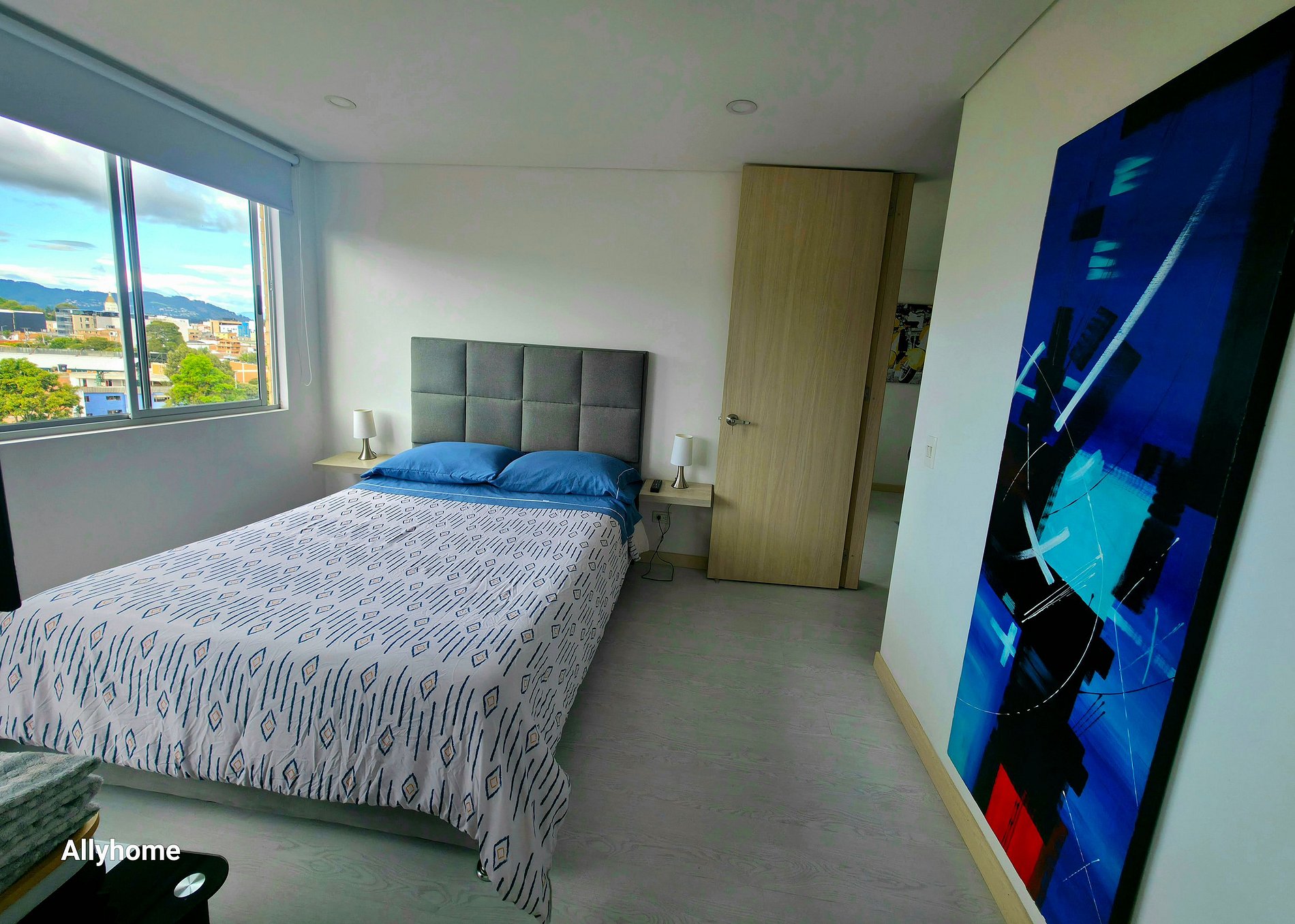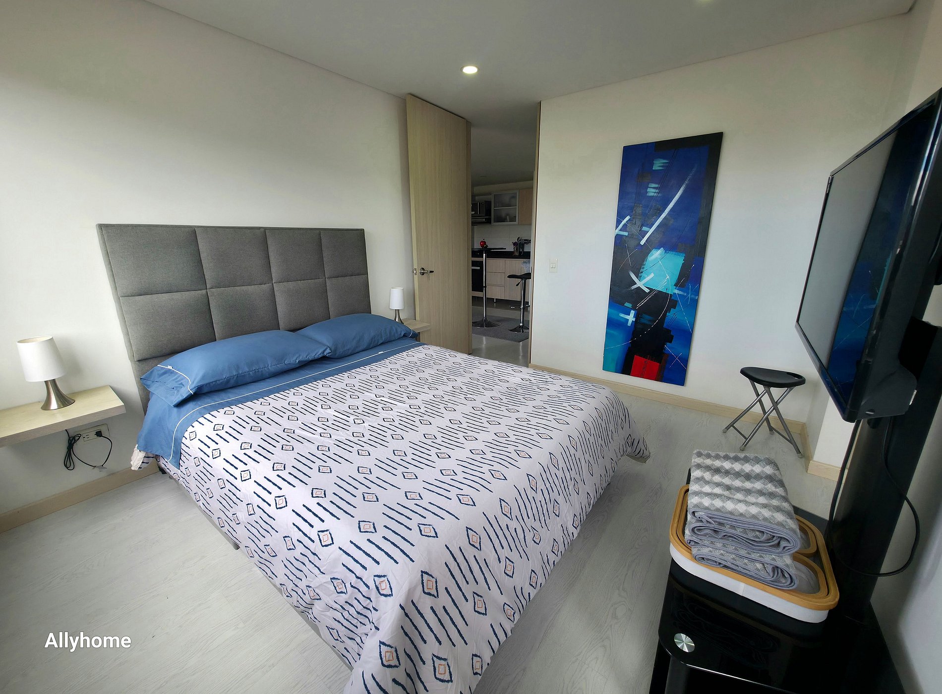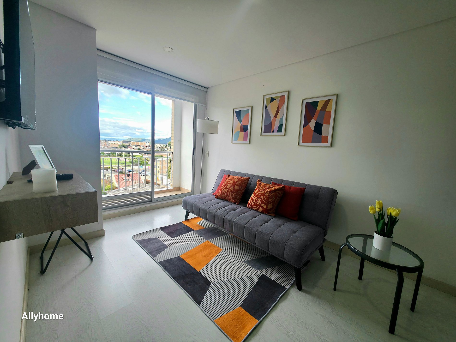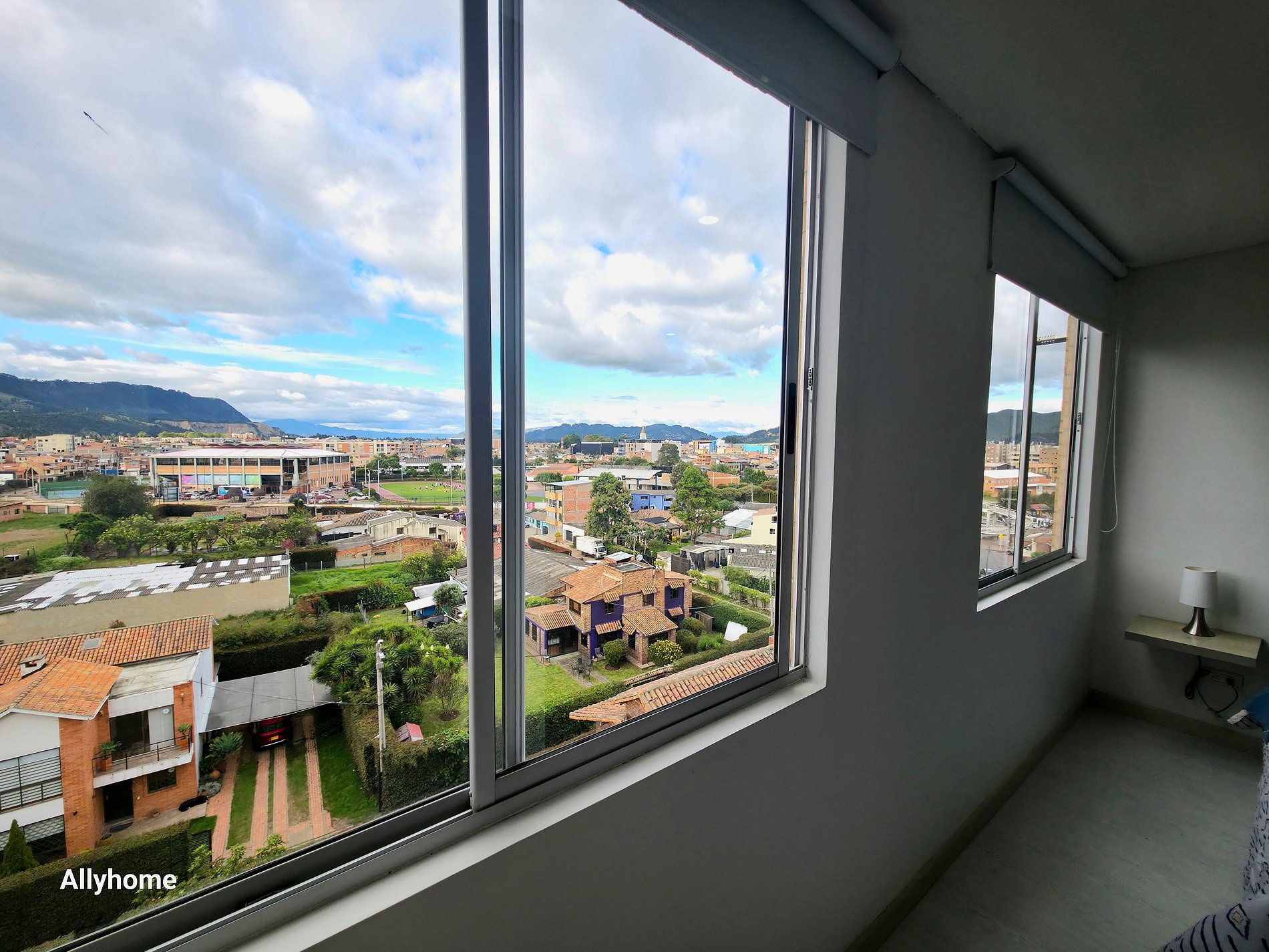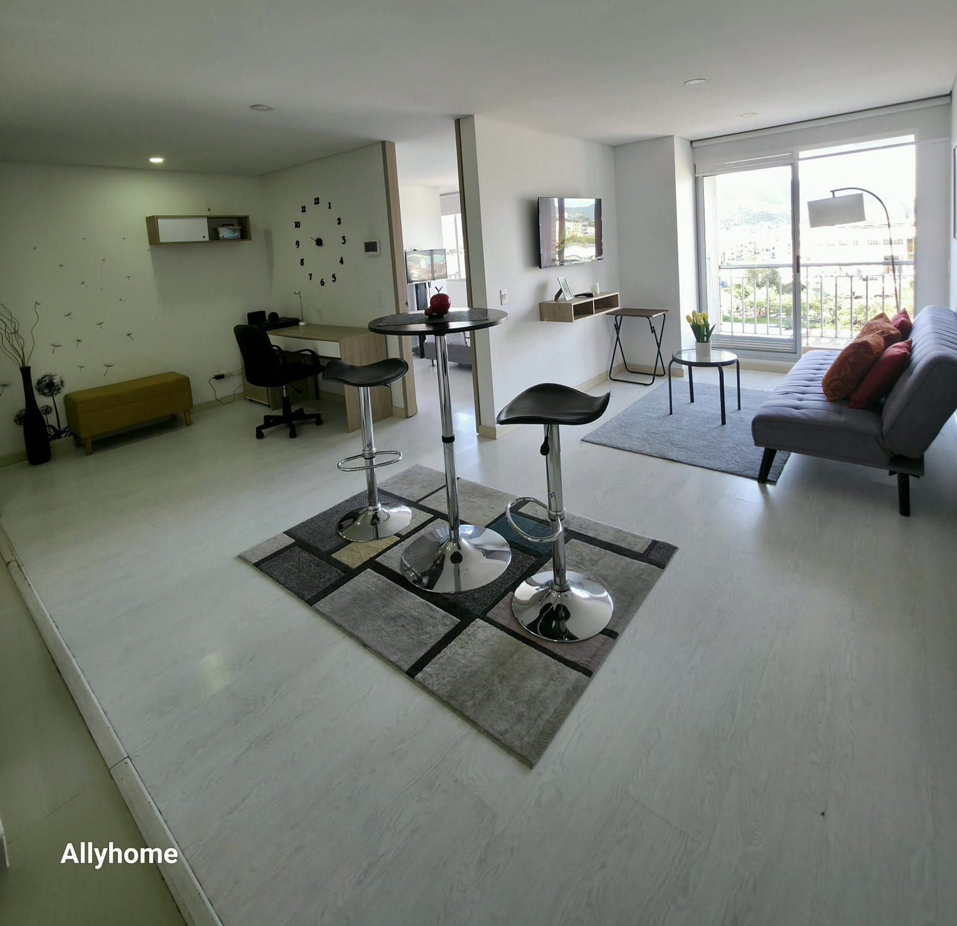 Apartaestudio con amplios espacios, el cuarto principal cuenta con iluminación natural y hermosa vista de Cajicá, cama doble, amplio Closet de ropa, baño privado y calentador de agua. Sala de estar con Sofacama doble, comedor y una amplia cocina integral equipada, espacio de estudio para trabajo Home Office y un amplio balcón con vsita hacia el coliceo de Cajicá y la sabana.