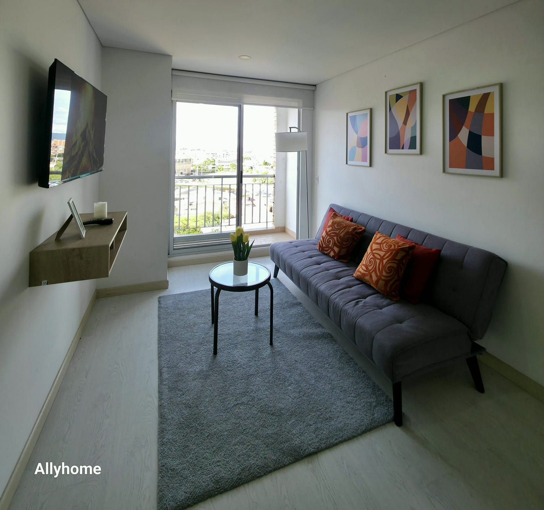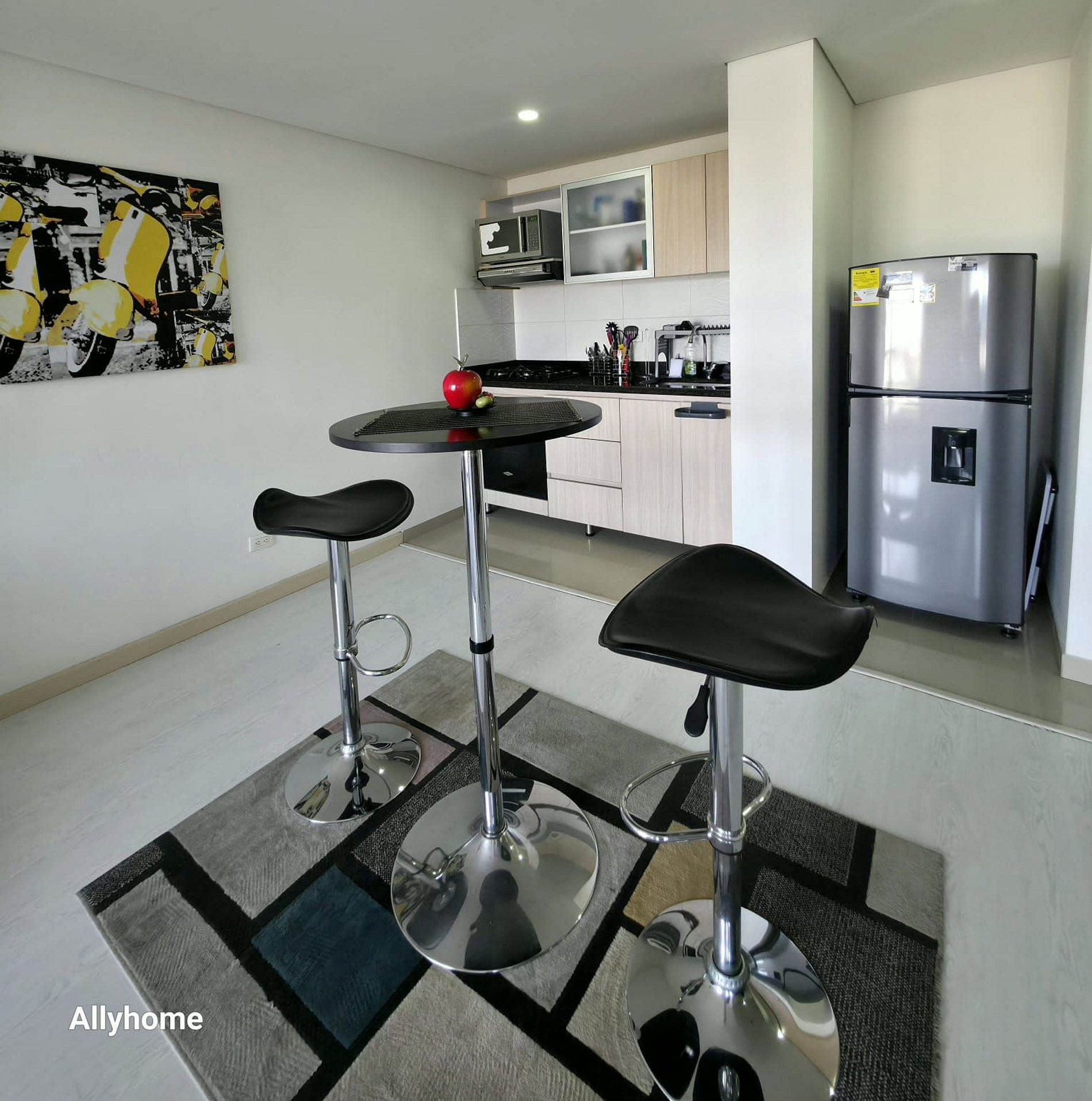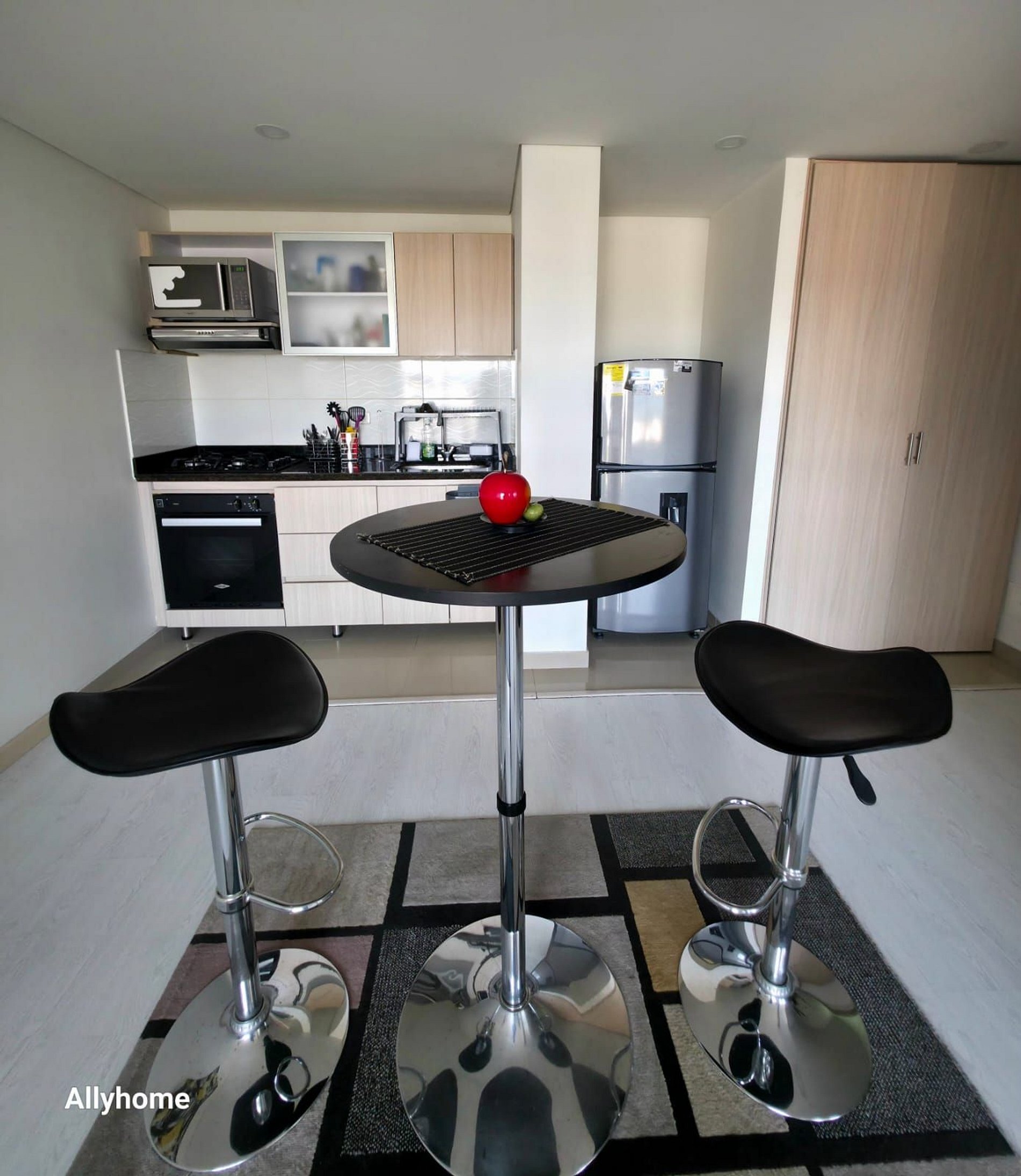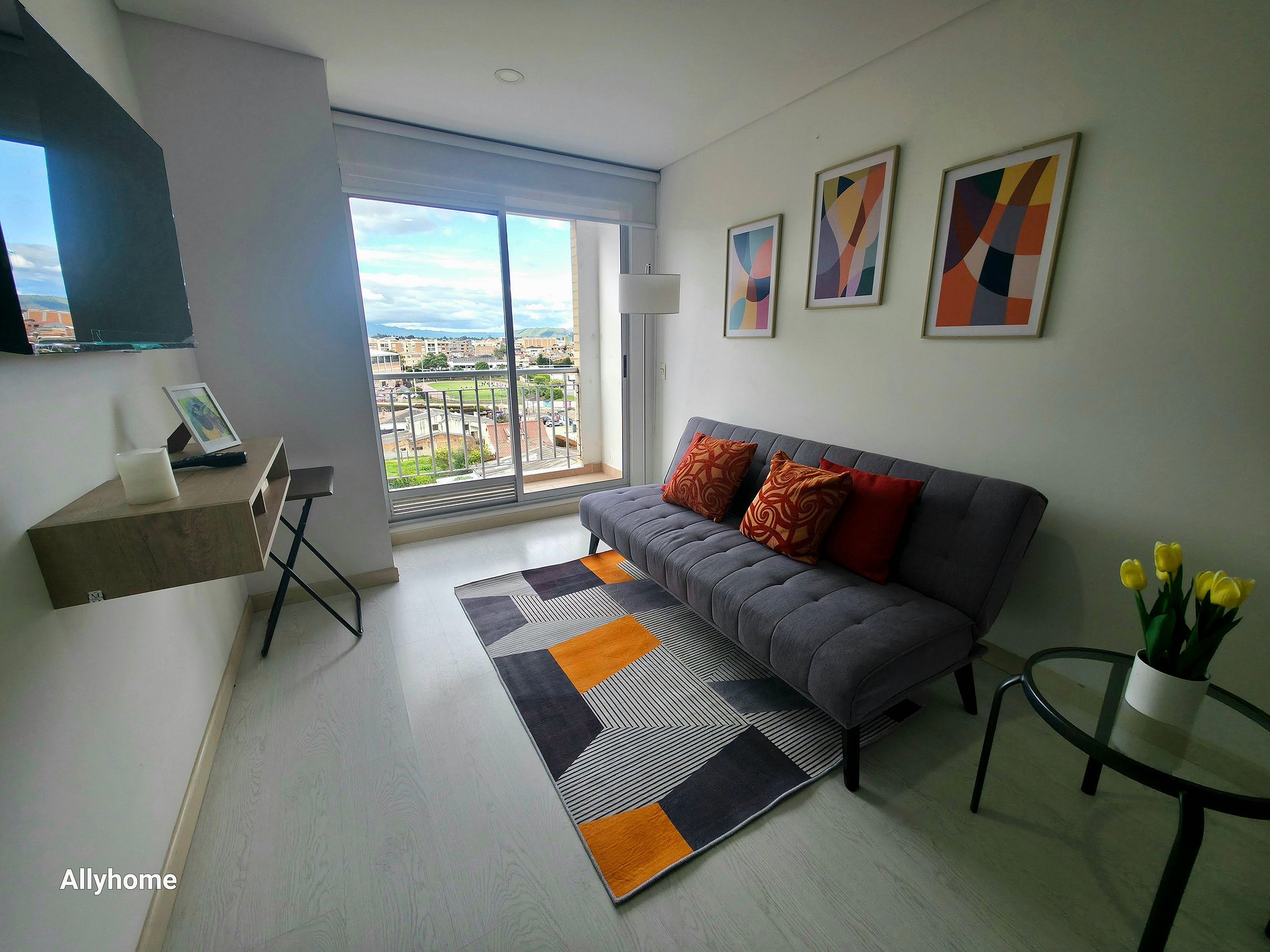 Apartaestudio con amplios espacios, el cuarto principal cuenta con iluminación natural y hermosa vista de Cajicá, cama doble, amplio Closet de ropa, baño privado y calentador de agua. Sala de estar con Sofacama doble, comedor y una amplia cocina integral equipada, espacio de estudio para trabajo Home Office y un amplio balcón con vsita hacia el coliceo de Cajicá y la sabana.