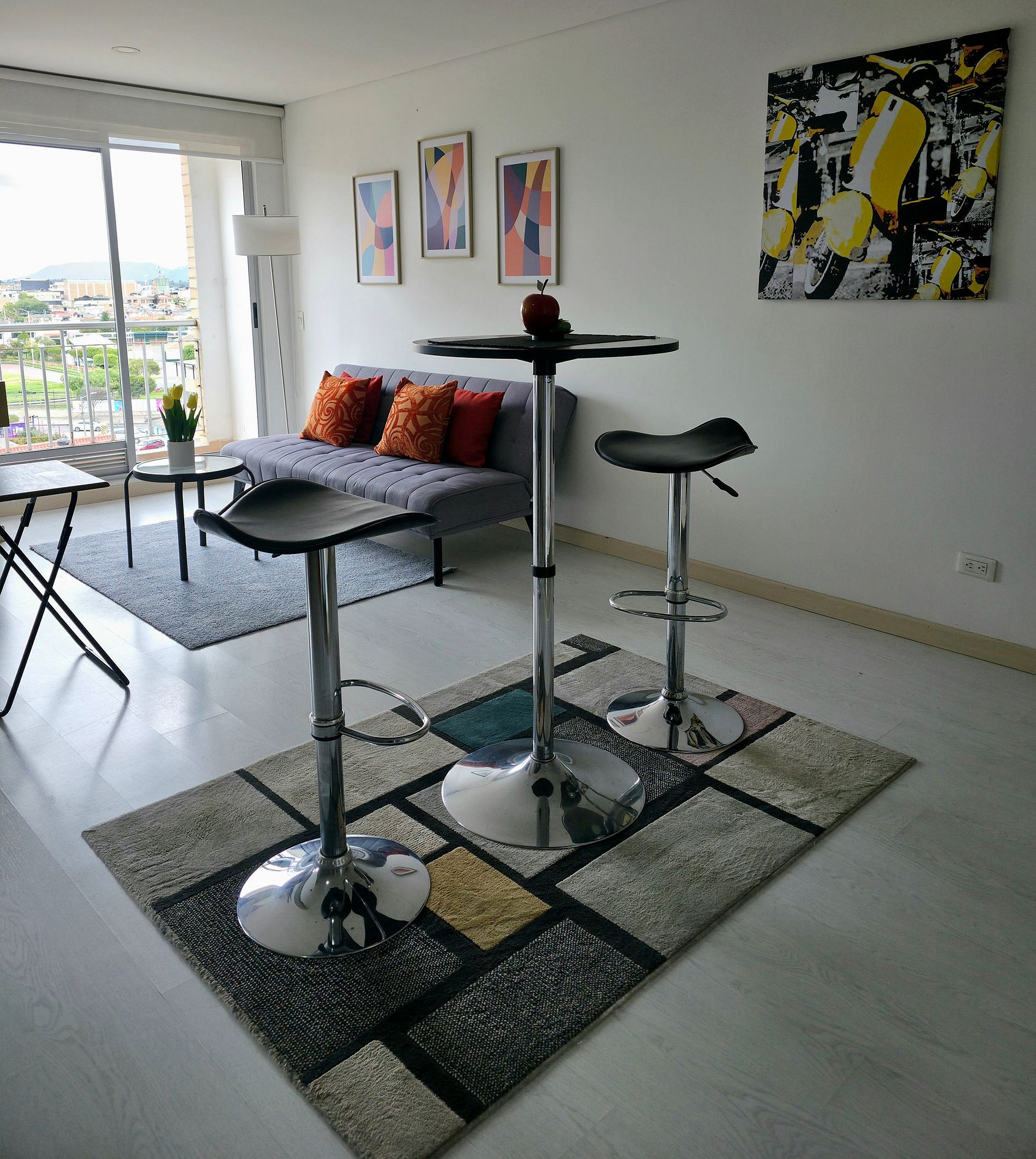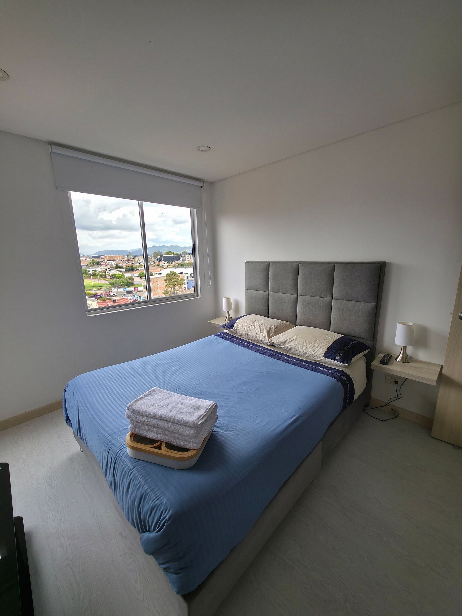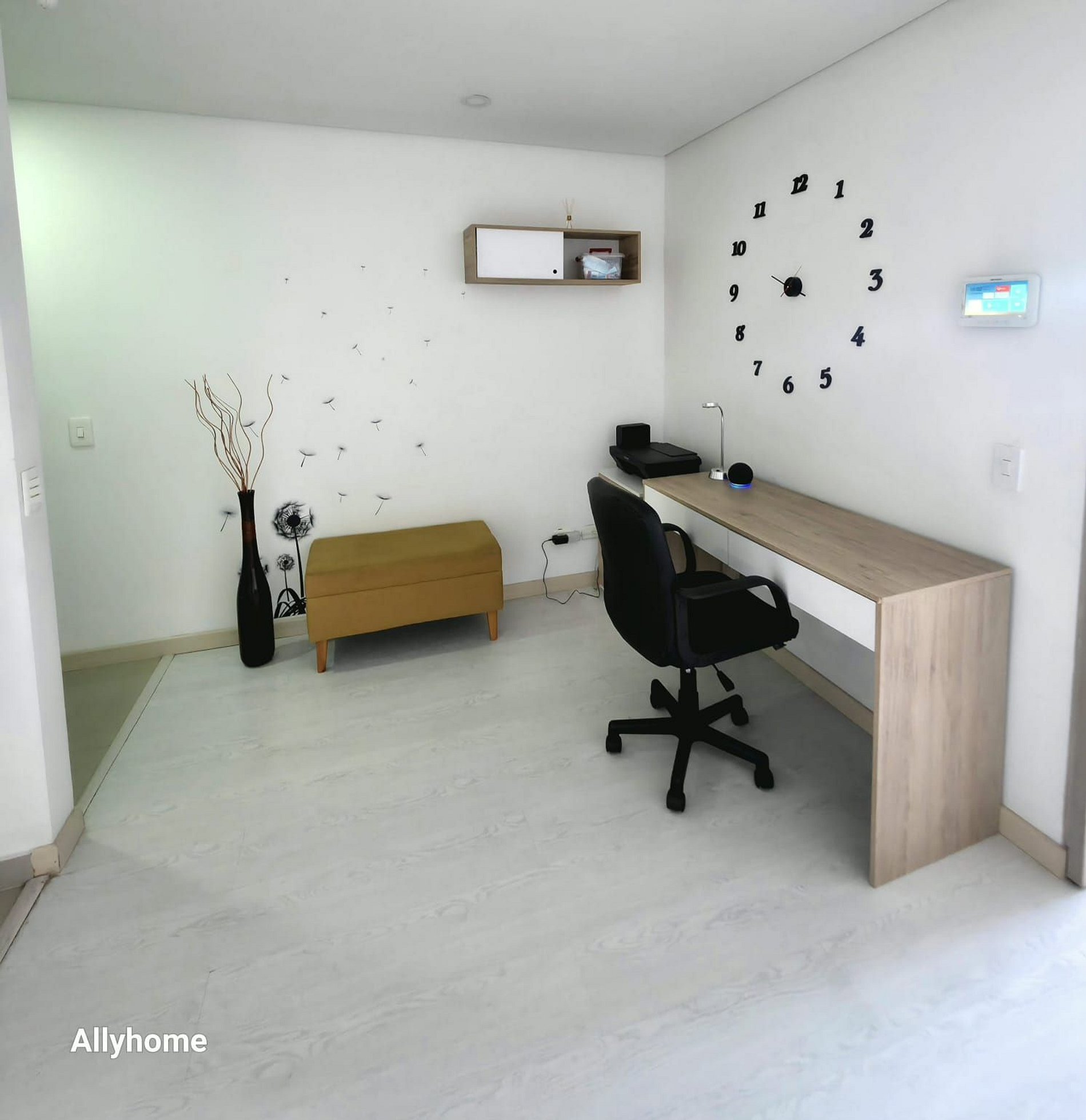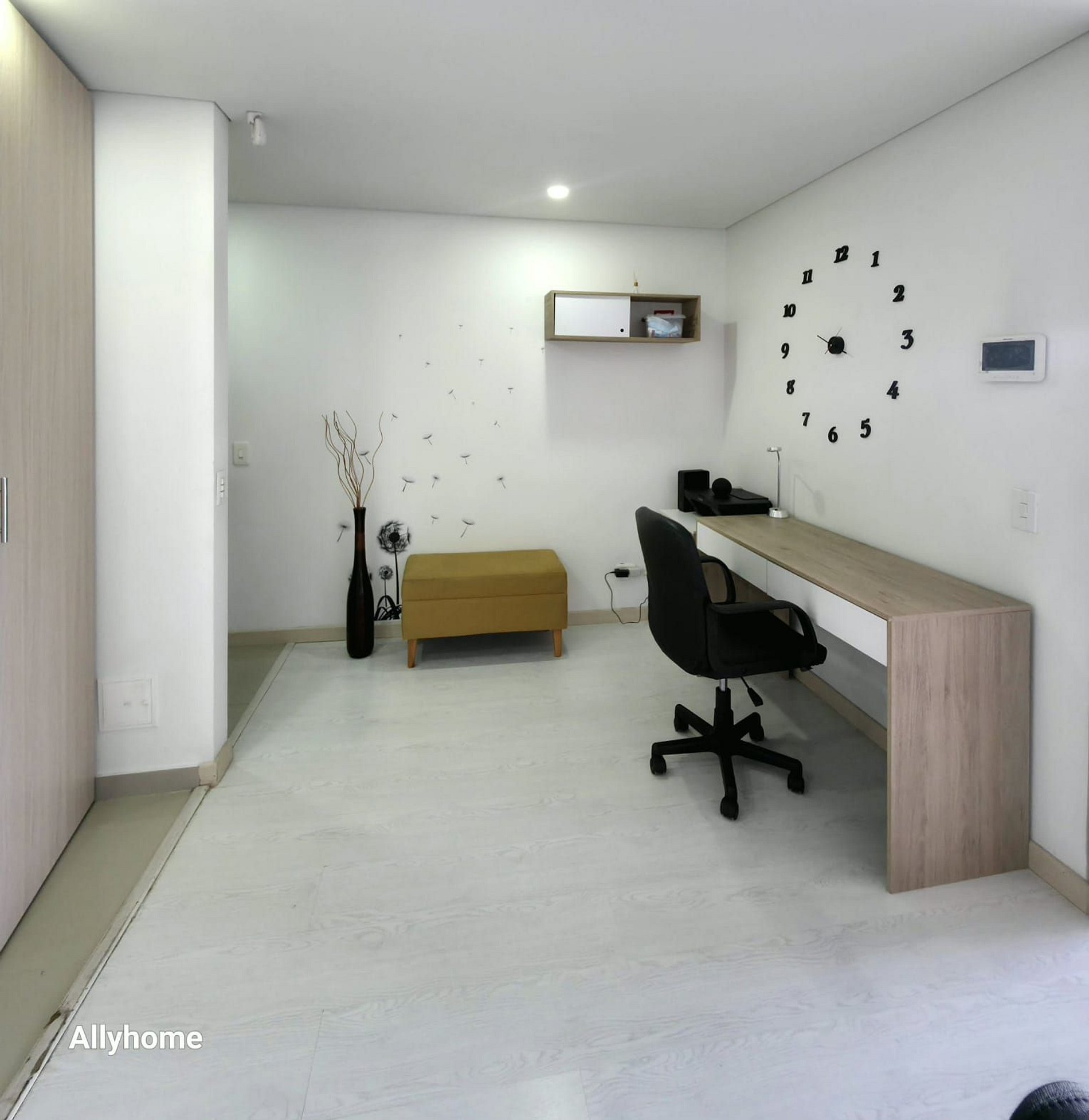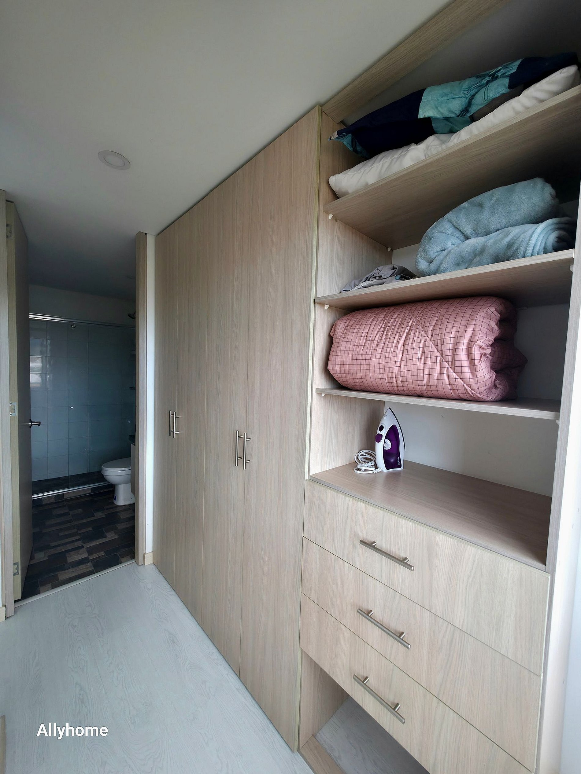Apartaestudio con amplios espacios, el cuarto principal cuenta con iluminación natural y hermosa vista de Cajicá, cama doble, amplio Closet de ropa, baño privado y calentador de agua. Sala de estar con Sofacama doble, comedor y una amplia cocina integral equipada, espacio de estudio para trabajo Home Office y un amplio balcón con vsita hacia el coliceo de Cajicá y la sabana.