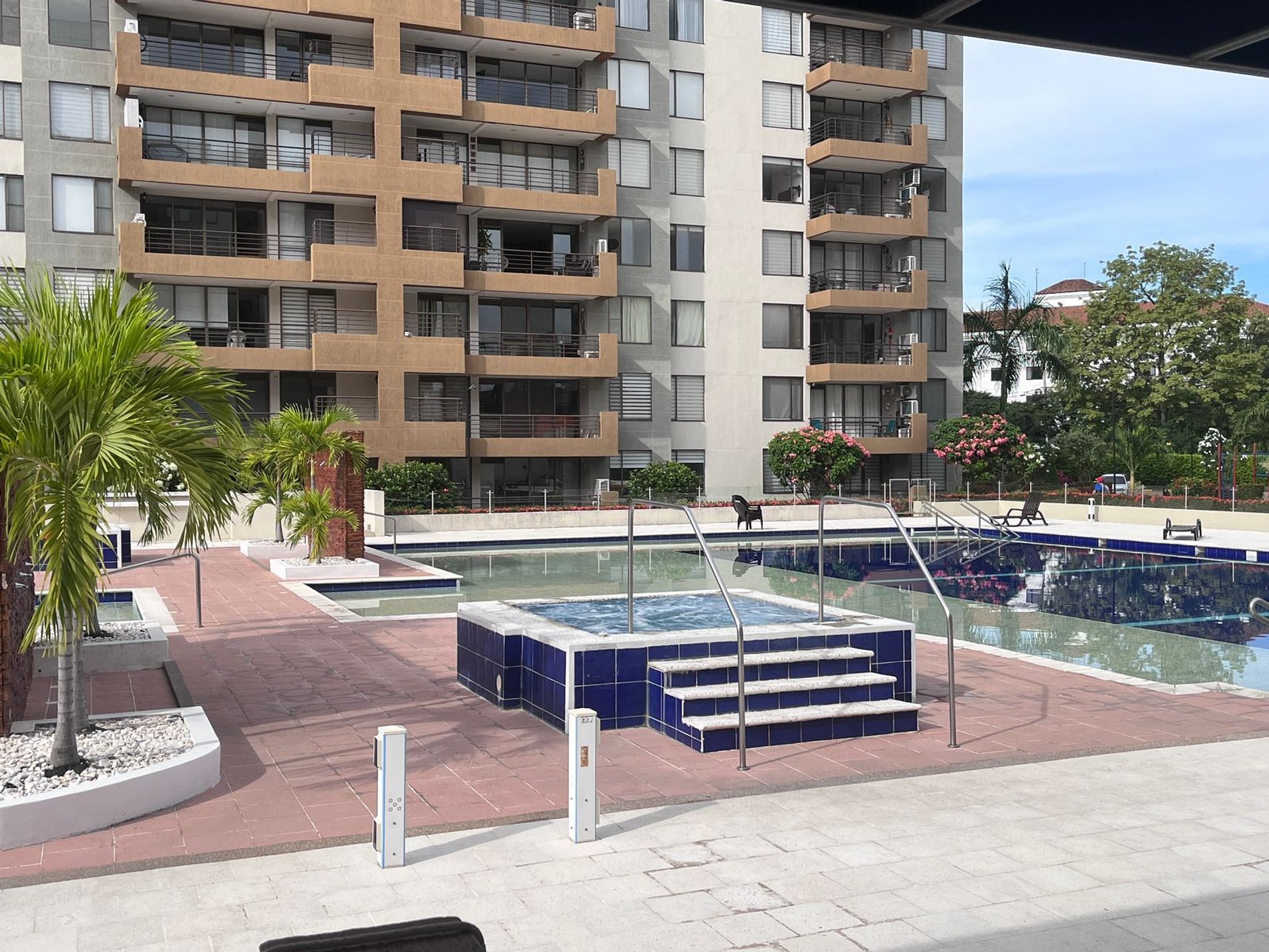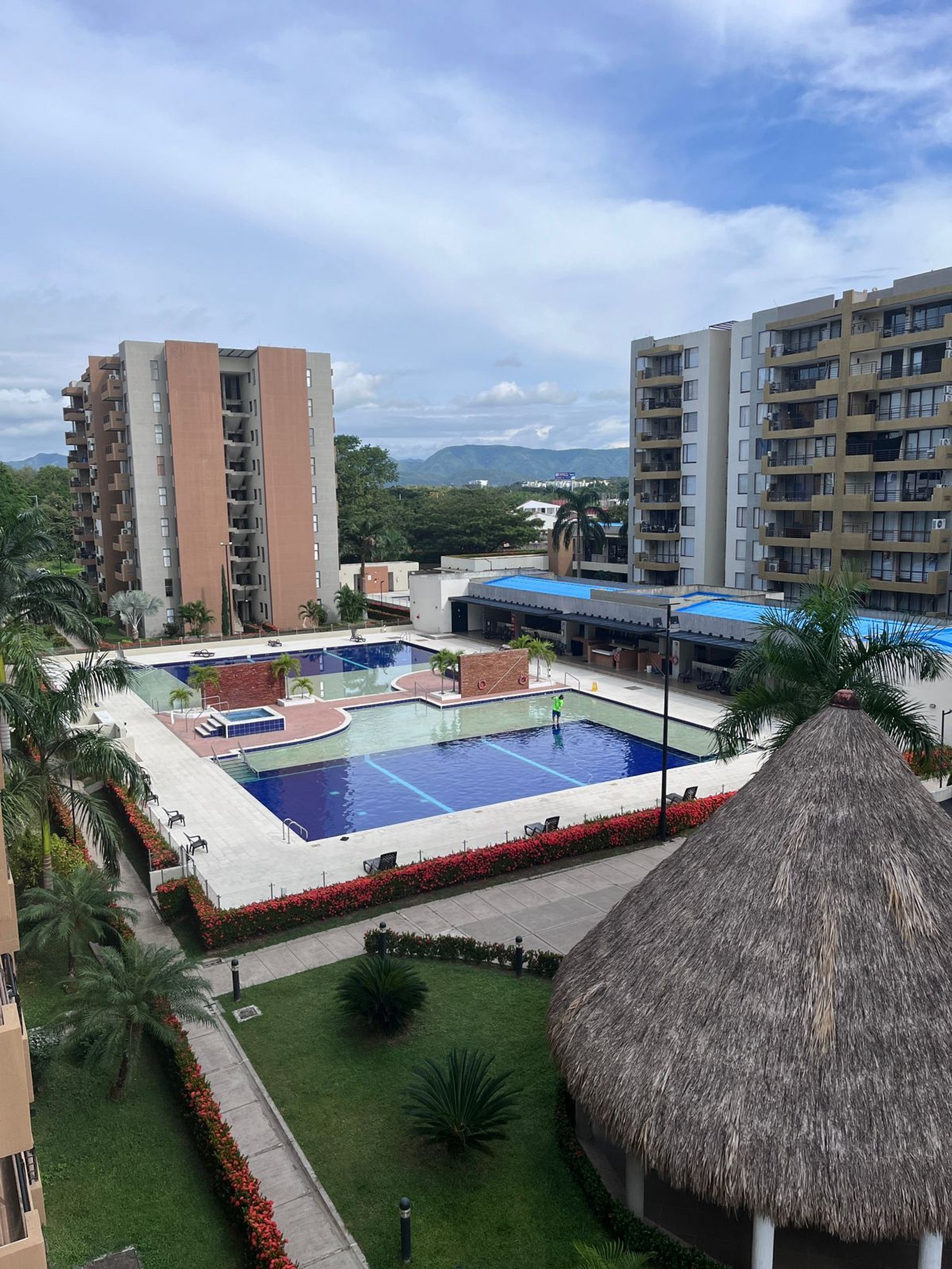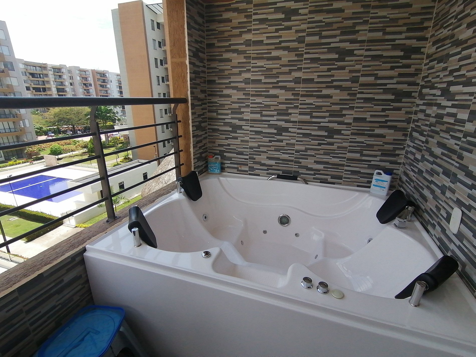 Confortable Apartamento ubicado en 5 piso con vista a la piscina, cuenta con 3 habitaciones con puertas corredizas, camas semi dobles mas nido; Alcoba principal cama King, baño privado y salida al balcón, amplios espacios en la sala y cocina dotada, un amplio balcón con comedor exterior y Jacuzzi para disfrutar en familia, cuenta con Tv directv, Internet fibra Óptica, parlante bluetooth, ventiladores, zona de ropas.