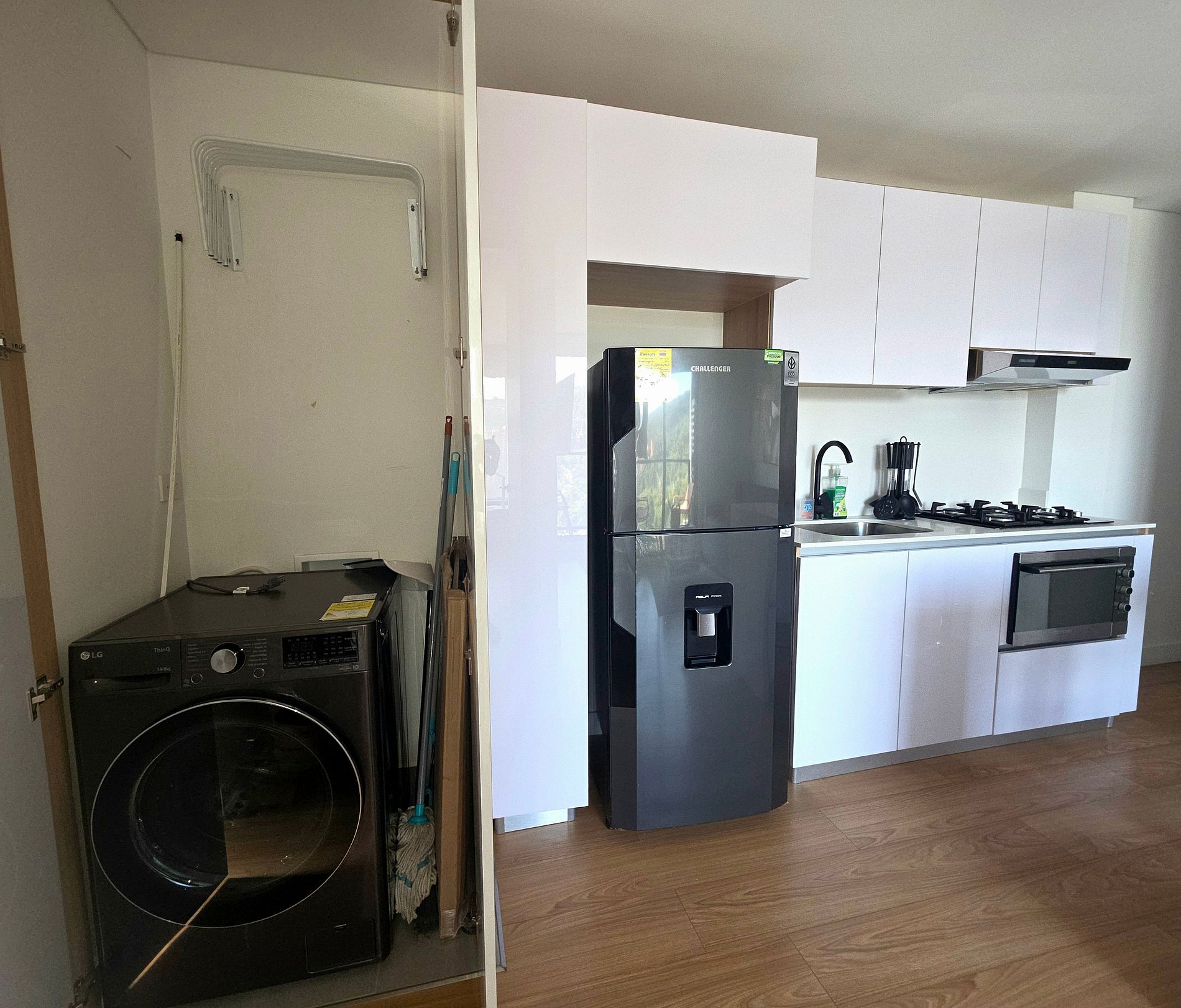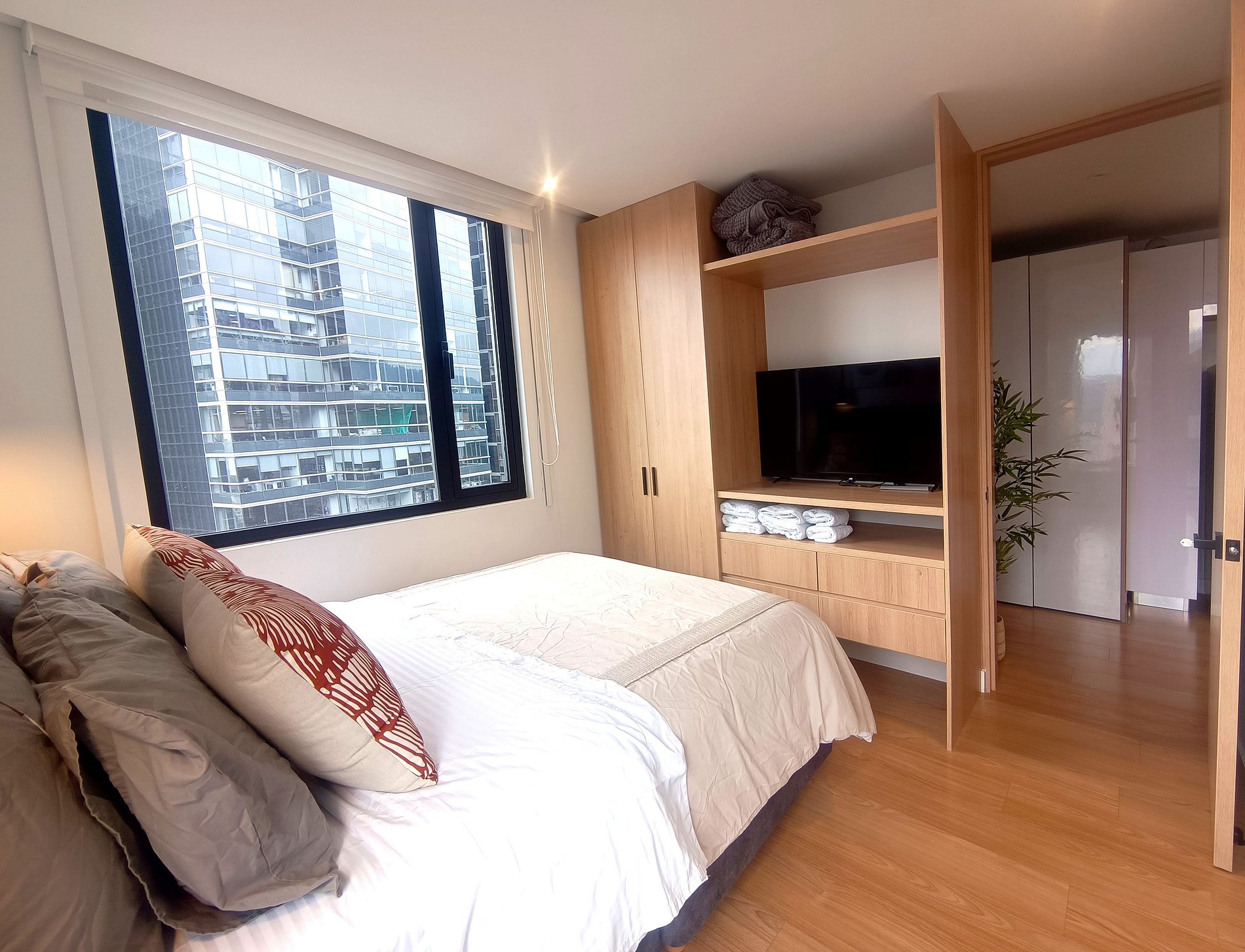 Equipado con cada detalle para una estadía placentera con lenceria de alta calidad, balcón, habitación independiente, cama doble, cocina equipada, nevera, lavadora - secadora, calentador de agua, compartimentos tipo closet, sofacama semi doble, Tv en habitación y sala, Netflix , Wifi 5G, cortina y blackout, parqueadero privado y Llegada autónoma con cerradura Digital,
