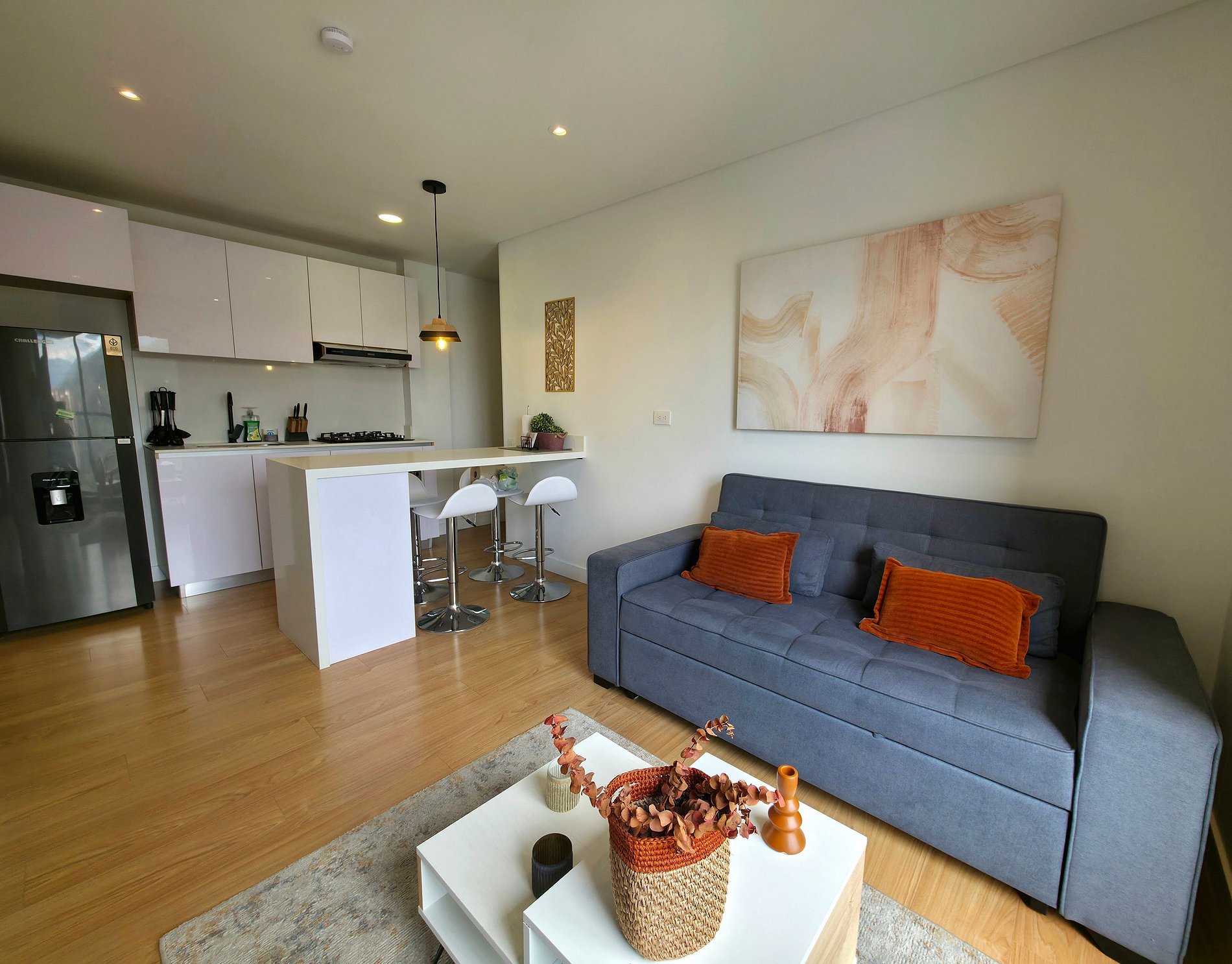 Equipado con cada detalle para una estadía placentera con lenceria de alta calidad, balcón, habitación independiente, cama doble, cocina equipada, nevera, lavadora - secadora, calentador de agua, compartimentos tipo closet, sofacama semi doble, Tv en habitación y sala, Netflix , Wifi 5G, cortina y blackout, parqueadero privado y Llegada autónoma con cerradura Digital,