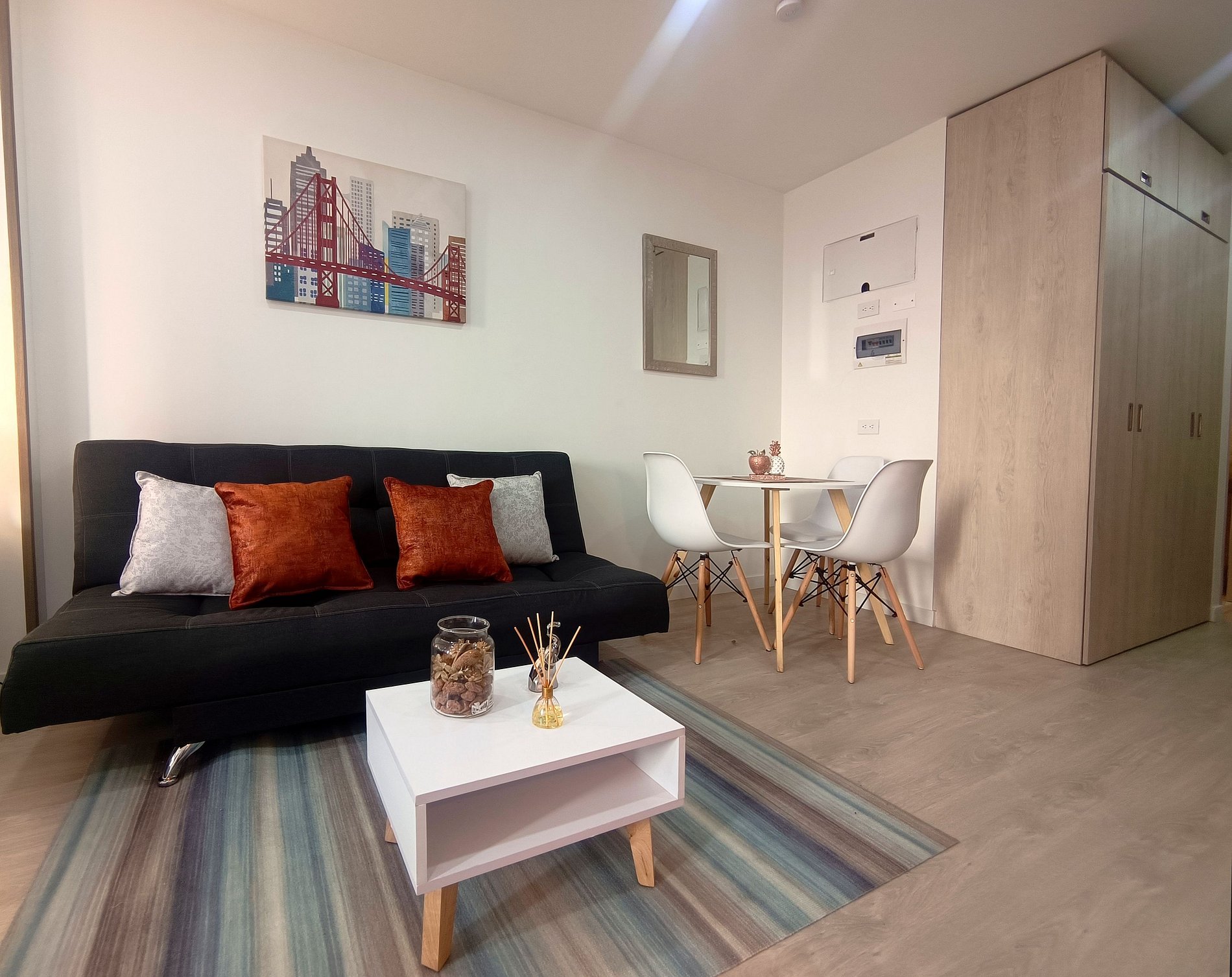 Bienvenido a este encantador Loft, piso 7°, te ofrece una experiencia única combinando confort, tecnología. Despiértate con una vista panorámica, tecnología inteligente con Alexa, tu asistente virtual para música, alarmas, TV 55", Cocina equipada y parking privado. Ubicación a 100Mts de la carrera7/calle155, Mall North Point, Teatro Belarte, Parque Usaquén, Parque 93, Zona T, Country, Centro comercial Unicentro, Palatino, Hacienda Santa bárbara, Cedritos. clinica Santa Fe, Cardioinfantil.