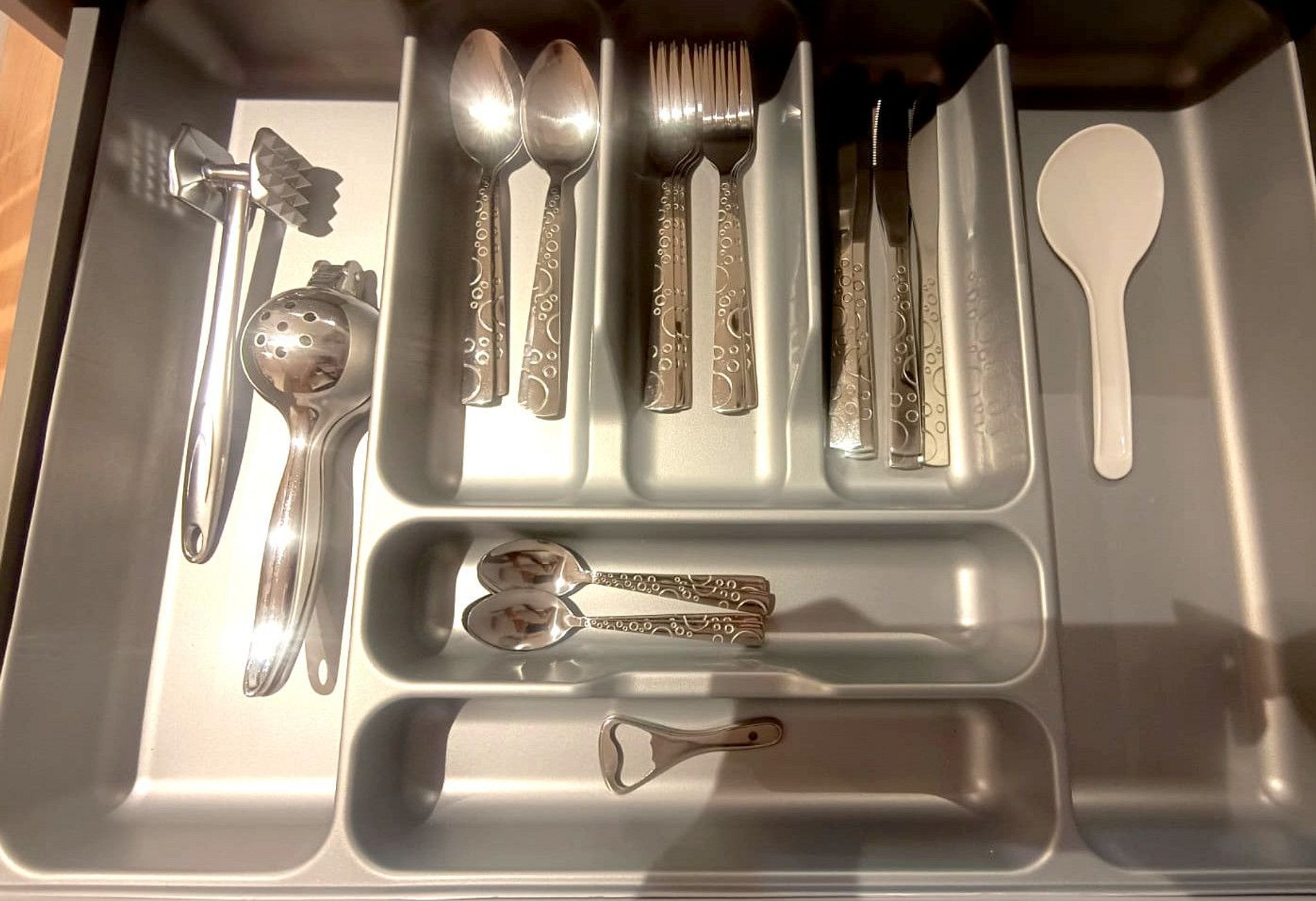 Cocina equipada: horno, nevera, lavadora-secadora, y calentador de agua para ducha y cocina.
