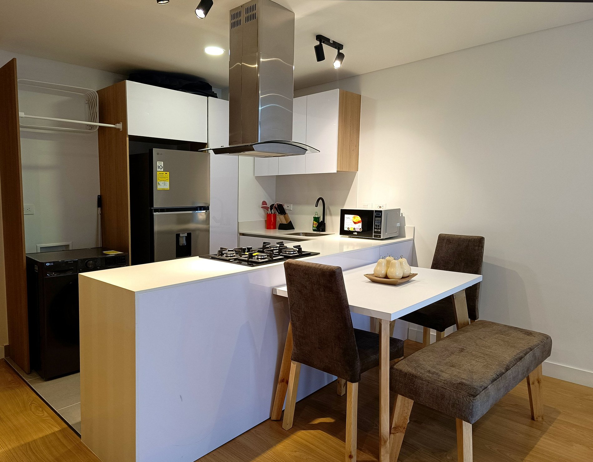 Comodidad sin igual: Amplios espacios, cocina equipada y sala con detalles de diseño que harán de tu estadía una Debido al desarrollo del proyecto de construcción, tomara un corto tiempo en habilitar las áreas sociales, el cual se puede visitar pero aún no están equipadas.