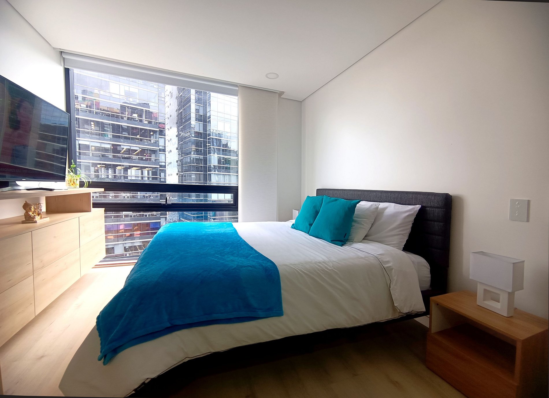 En este apartamento podrás disfrutar de espacios funcionales diseñados para tu comodidad. Desde una cocina completamente equipada para preparar tus comidas favoritas, hasta un área de descanso con una cómoda cama queen y una sala acogedora ideal para relajarte mientras disfrutas de la impresionante vista panorámica de la ciudad. Todo está pensado para que te sientas como en casa durante tu estadía."