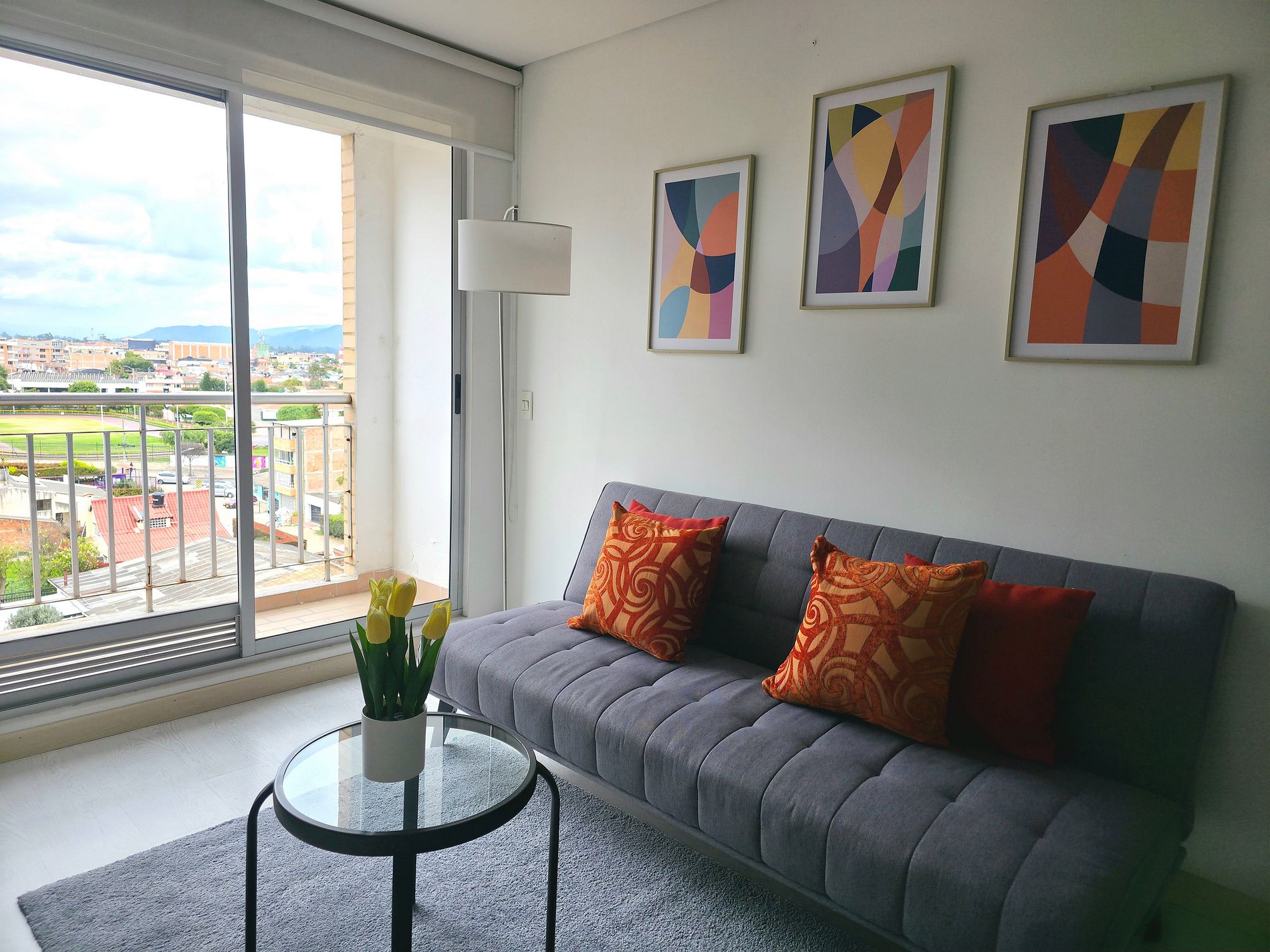 Apartaestudio con amplios espacios, el cuarto principal cuenta con iluminación natural y hermosa vista de Cajicá, cama doble, amplio Closet de ropa, baño privado y calentador de agua. Sala de estar con Sofacama doble, comedor y una amplia cocina integral equipada, espacio de estudio para trabajo Home Office y un amplio balcón con vsita hacia el coliceo de Cajicá y la sabana.